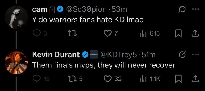 网友A:“勇士球迷真的恨KD啊,哈哈。”